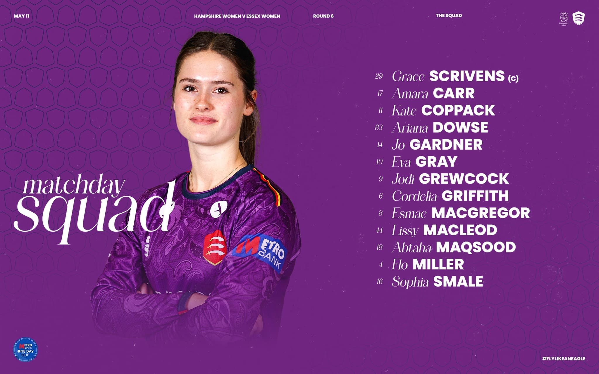 Essex Women have named a 13-player squad for the trip down the M3 on Sunday, who will be captained by Grace Scrivens who struck the first century of the season during the last outing against The Blaze on Tuesday.