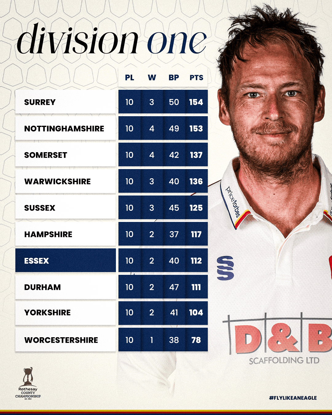 The end came when Critchley bowled Henry Crocombe for two. The leg-spinner finished with four for 41 and played his part in an excellent performance by Essex, who will fancy their chances of climbing the table in the remaining four games now they have a full-strength bowling attack available again, having controlled this match from the first session.
