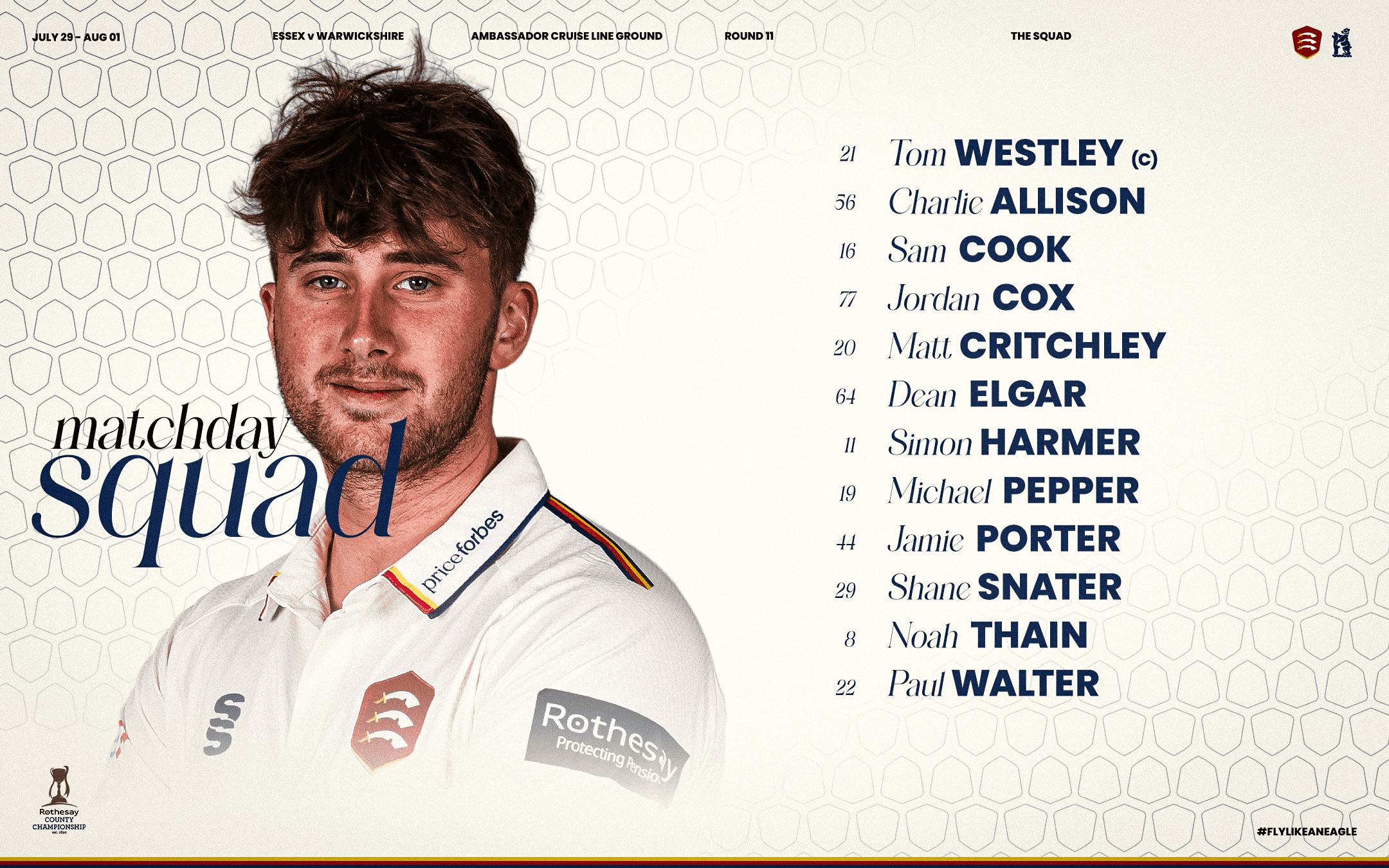 Essex: Dean Elgar, Paul Walter, Tom Westley (c), Jordan Cox, Matt Critchley, Michael Pepper (wk), Noah Thain, Simon Harmer, Sam Cook, Khaleel Ahmed, Jamie Porter.