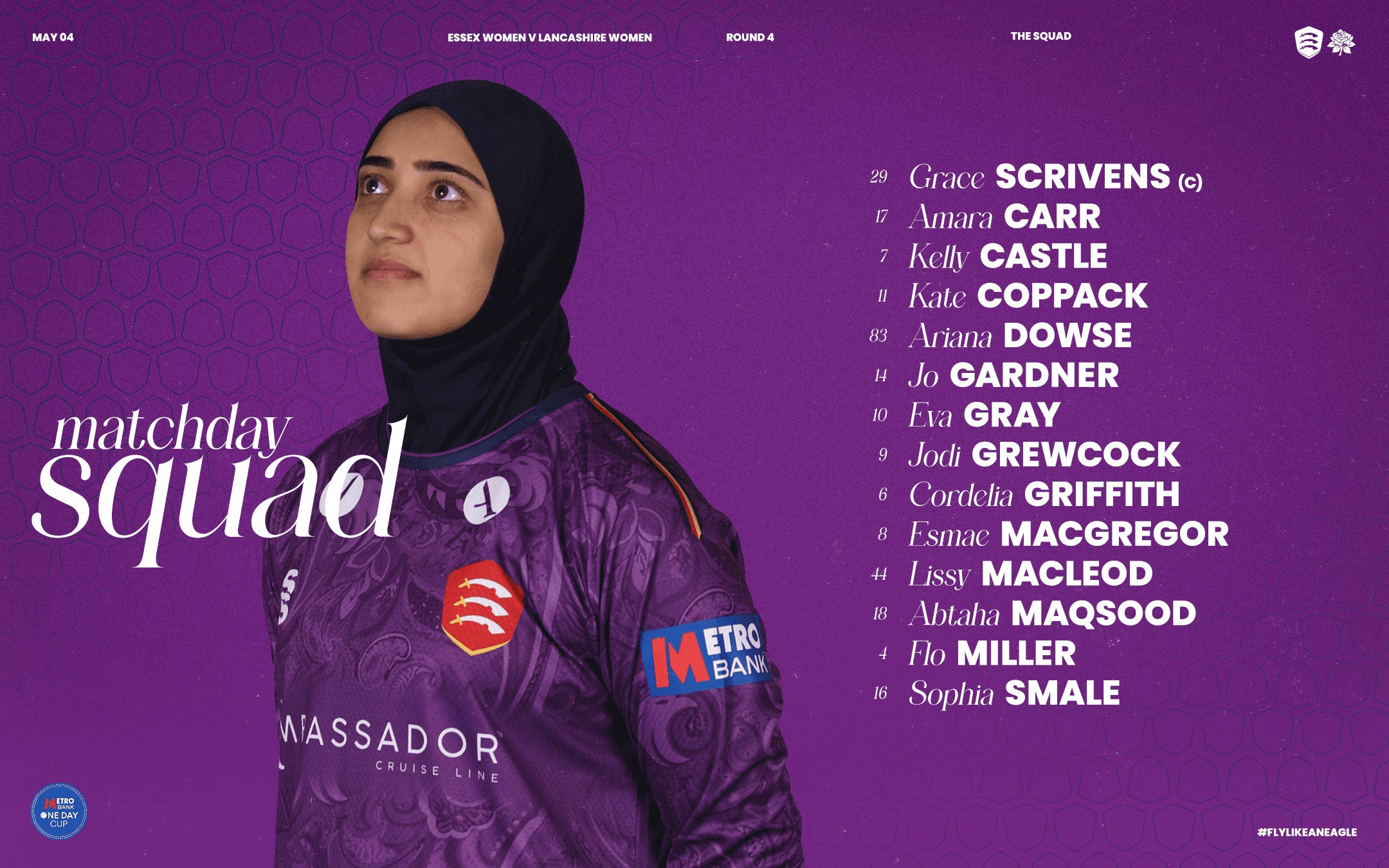 Essex Women: Grace Scrivens (c), Lissy Macleod, Cordelia Griffith, Jodi Grewcock, Flo Miller, Jo Gardner, Sophia Smale, Amara Carr (wk), Eva Gray, Kate Coppack, Abtaha Maqsood.