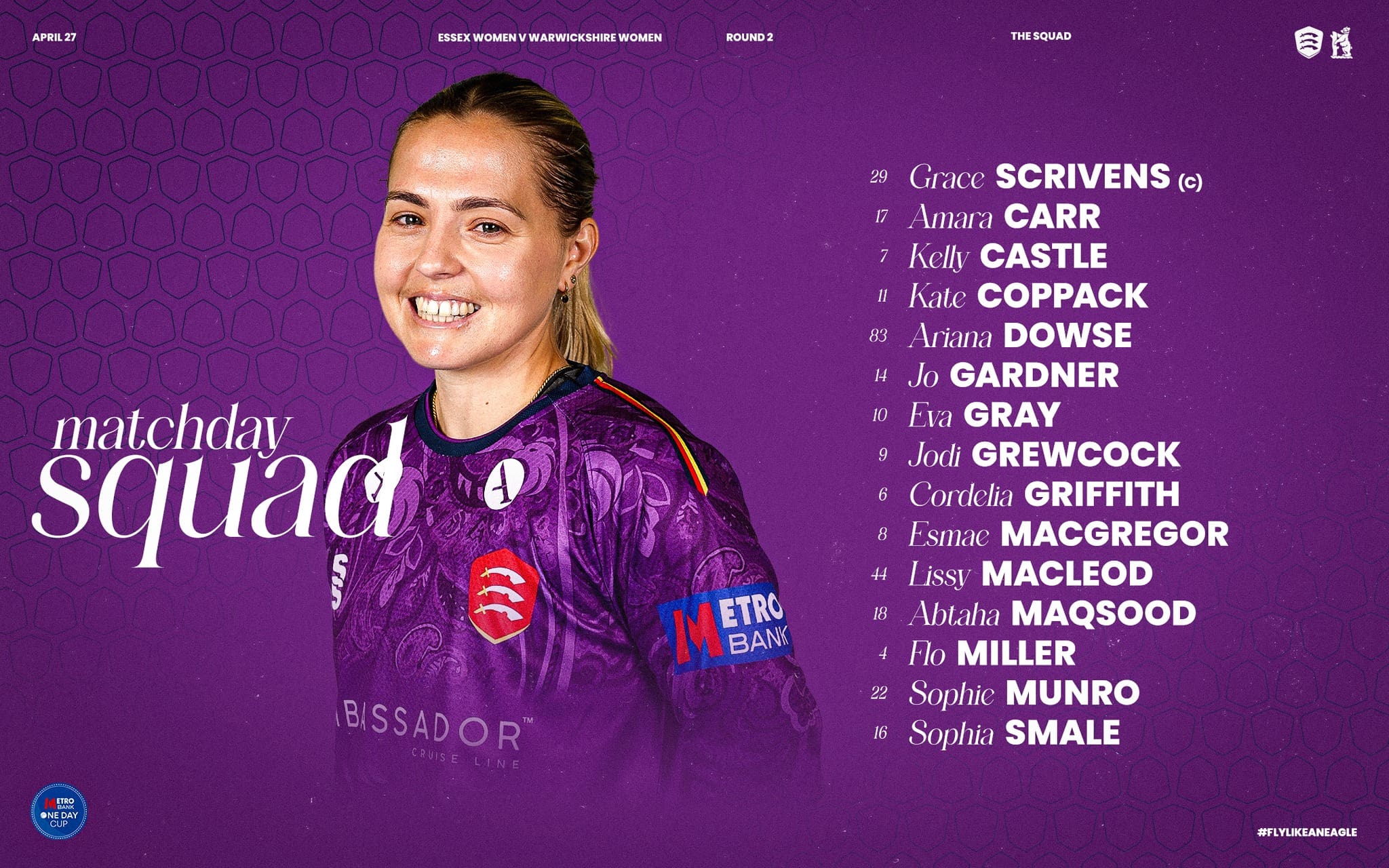 Essex: Grace Scrivens (c), Jo Gardner, Cordelia Griffith, Jodi Grewcock, Flo Miller, Lissy Macloed, Sophia Smale, Amara Carr (wk), Eva Gray, Kate Coppack, Esmae MacGregor.