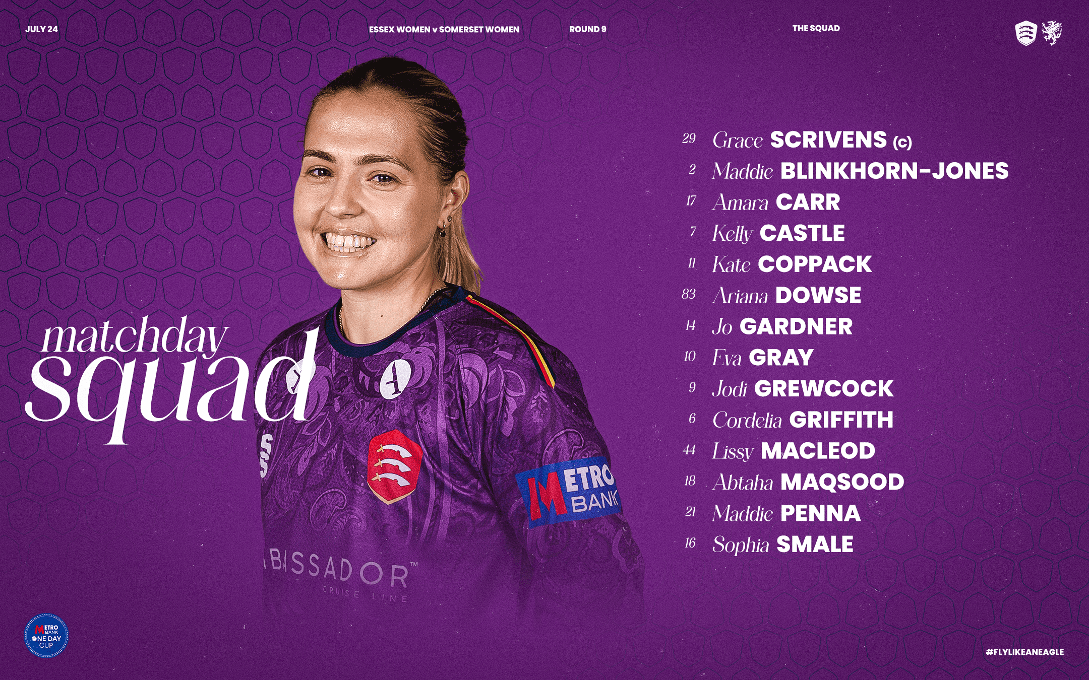 Essex Women: Grace Scrivens, Maddie Penna, Jodi Grewcock, Cordelia Griffith, Jo Gardner, Lissy Macleod, Eva Gray, Sophia Smale, Amara Carr (wk), Kate Coppack, Abtaha Maqsood.