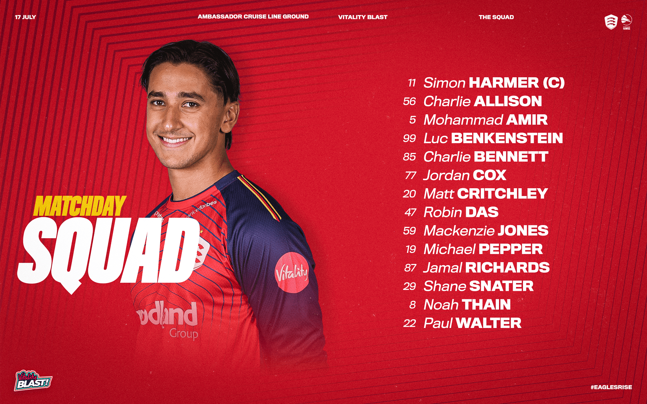 Essex Men: Michael Pepper, Paul Walter, Jordan Cox (wk), Matt Critchley, Luc Benkenstein, Charlie Allison, Matt Critchley, Noah Thain, Simon Harmer (c), Sam Cook, Mohammad Amir.