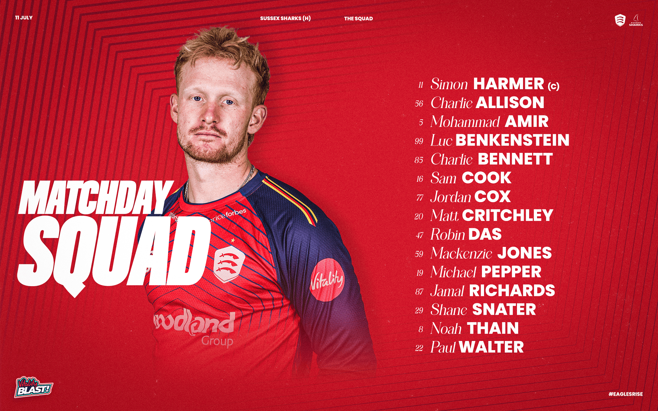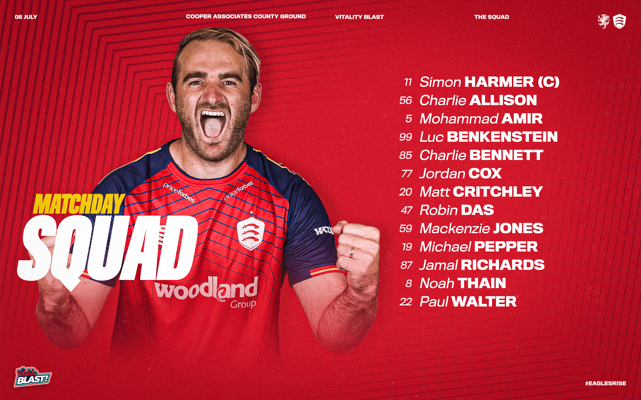 Essex Men: Michael Pepper, Paul Walter, Jordan Cox (wk), Matt Critchley, Luc Benkenstein, Charlie Allison, Matt Critchley, Noah Thain, Simon Harmer (c), Mohammad Amir, Charlie Bennett