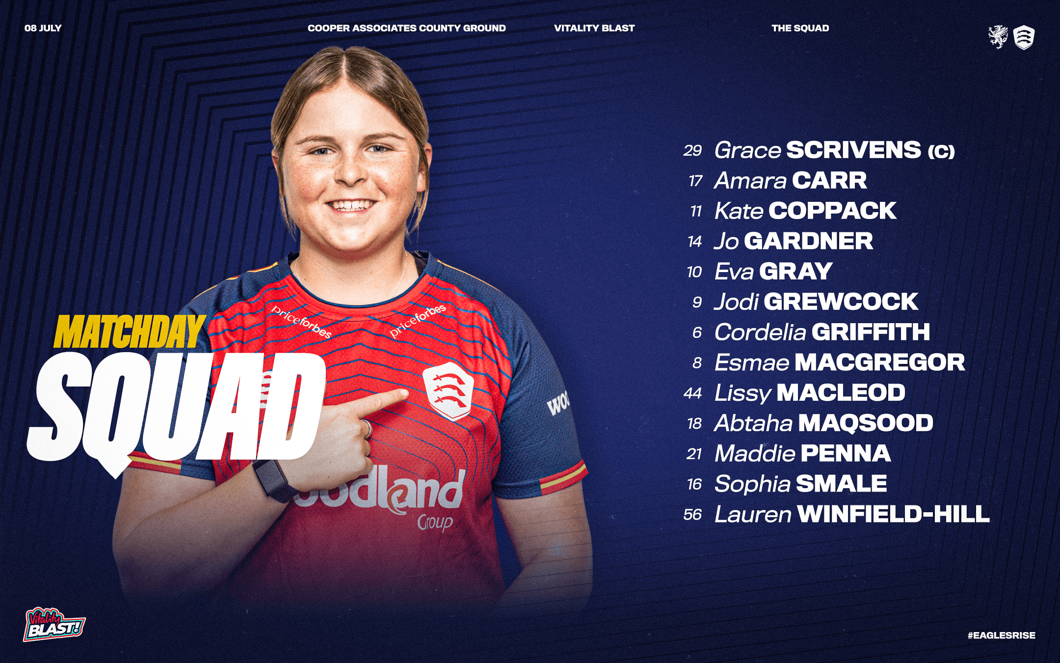 Essex Women: Lauren Winfield-Hill (wk), Grace Scrivens (C), Cordelia Griffith, Jodi Grewcock, Maddie Penna, Jo Gardner, Eva Gray, Sophia Smale, Kate Coppack, Esmae MacGregor, Abtaha Maqsood.